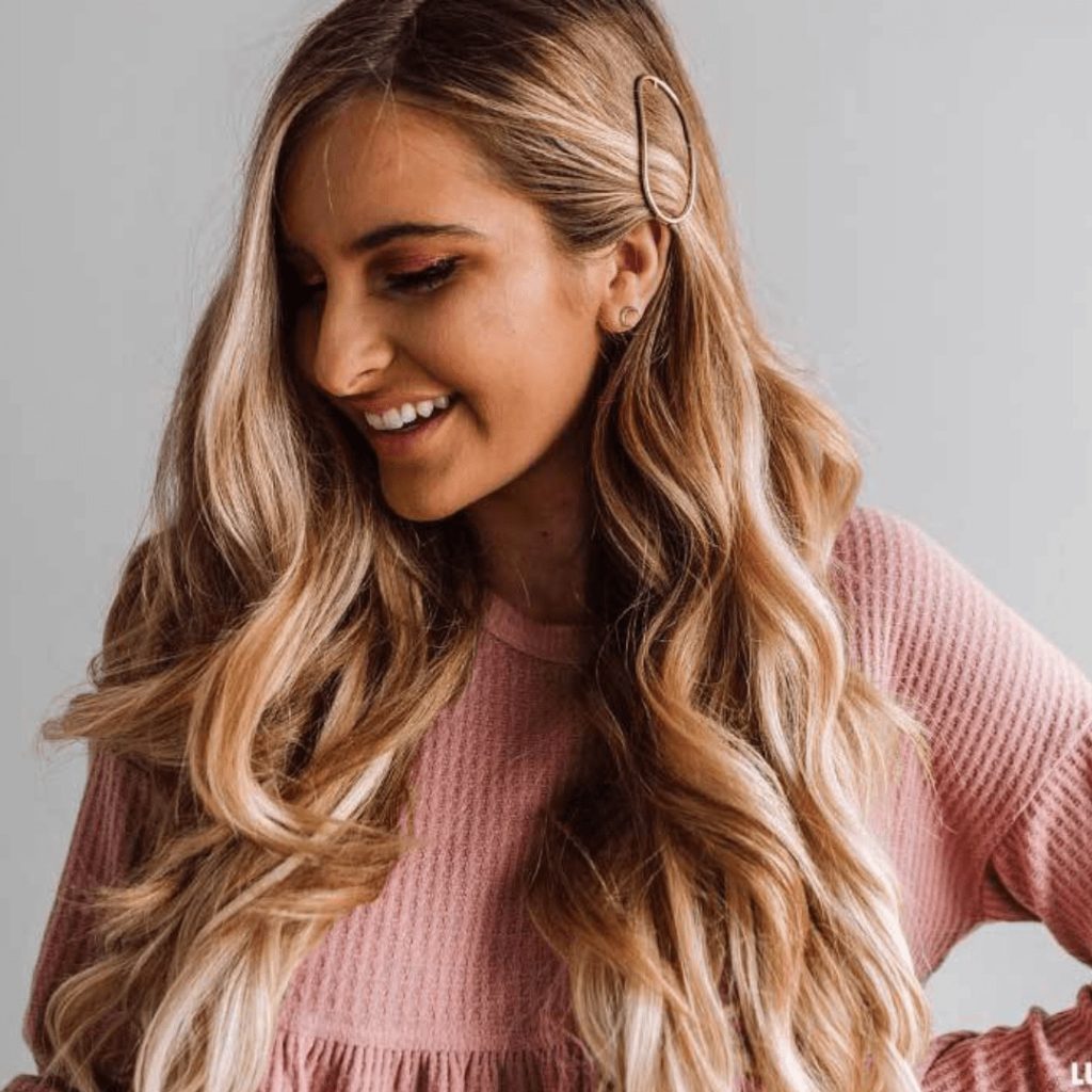I am putting two categories together in this picture because I think nothing is screaming more 2019 Spring Hair Trends than this. From the blush cotton knit top to the dimensional blonde hair pushed behind her ear, to the oversized hair clip!